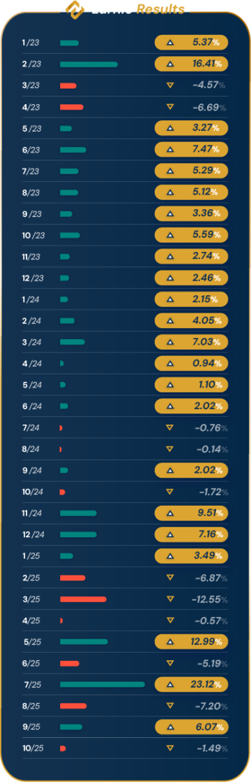 Simply create your Earnio account and allocate your funds for a month-long investment period. No need to stress about constantly monitoring the market, only see how your account performs month by month.