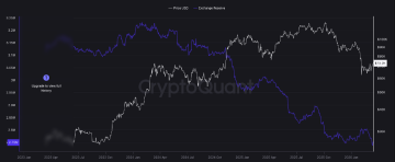 Můžeme vidět jak zásoba na burzách začíná opět klesat (modrá) zatímco cena lehce stoupá. Zdroj: cryptoquant.com