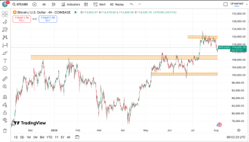 Bitcoin entered July around the $105–107K level, close to the June closing price. However, in the first two weeks, it gained significant momentum. On July 14, Bitcoin surged to a new all-time high of around $123,150, breaking the psychological $120,000 level. Shortly after, it corrected slightly back below that level, but still closed the month around $115–116K, up around 8% from the beginning (Coindesk). The key support level moved to around $112–110K (the previous May high), and it successfully tested that upper boundary as new support in July. If Bitcoin holds this level, it could serve as a good foundation for another growth wave. On the other hand, the ~$120,000 level is proving to be a significant resistance. A major breakout above $125K (which Bitcoin has unsuccessfully tried) could open the door for further growth, while a drop would find strong support at the psychological $100,000 level.