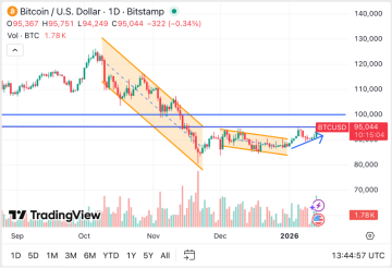 V současnosti Bitcoin bojuje o hranici 95 000 dolarů, což by byl první výraznější krok k odrazu směrem nahoru. Zdroj: TradingView.com