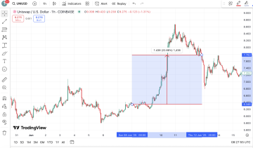 Příklad ziskového obchodu ve stejné páru UNIUSD, tentokrát strategií RFR, která zachytila vzestupný pohyb a uzavřela pozici až po vyčerpání pohybu.