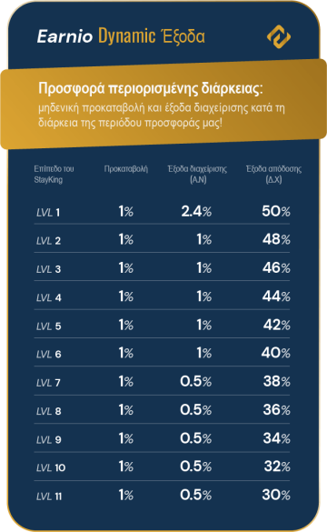 Το Earnio Dynamic περιλαμβάνει προκαταβολή για την κατανομή, τακτική αμοιβή διαχείρισης και αμοιβή απόδοσης που συνδέεται με τα αποτελέσματα συναλλαγών και το επίπεδο StayKing, με το επίπεδο 1 ως προεπιλογή για κάθε νέο χρήστη.
