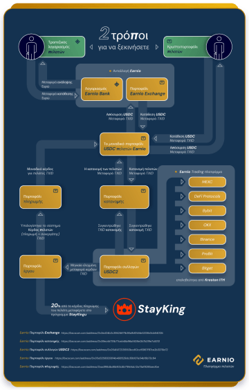 Οι συναλλαγές στον κόσμο των κρυπτονομισμάτων μπορεί να φαίνεται ότι είναι αρκετά περίπλοκο πράγμα. Αλλά είναι καλό να γνωρίζετε ακριβώς τι συμβαίνει με τα κεφάλαιά σας, πού ρέουν και γιατί. Γι' αυτό έχουμε ετοιμάσει μια απλή αλλά περιεκτική γραφική αναπαράσταση της ροής κεφαλαίων στο Earnio.